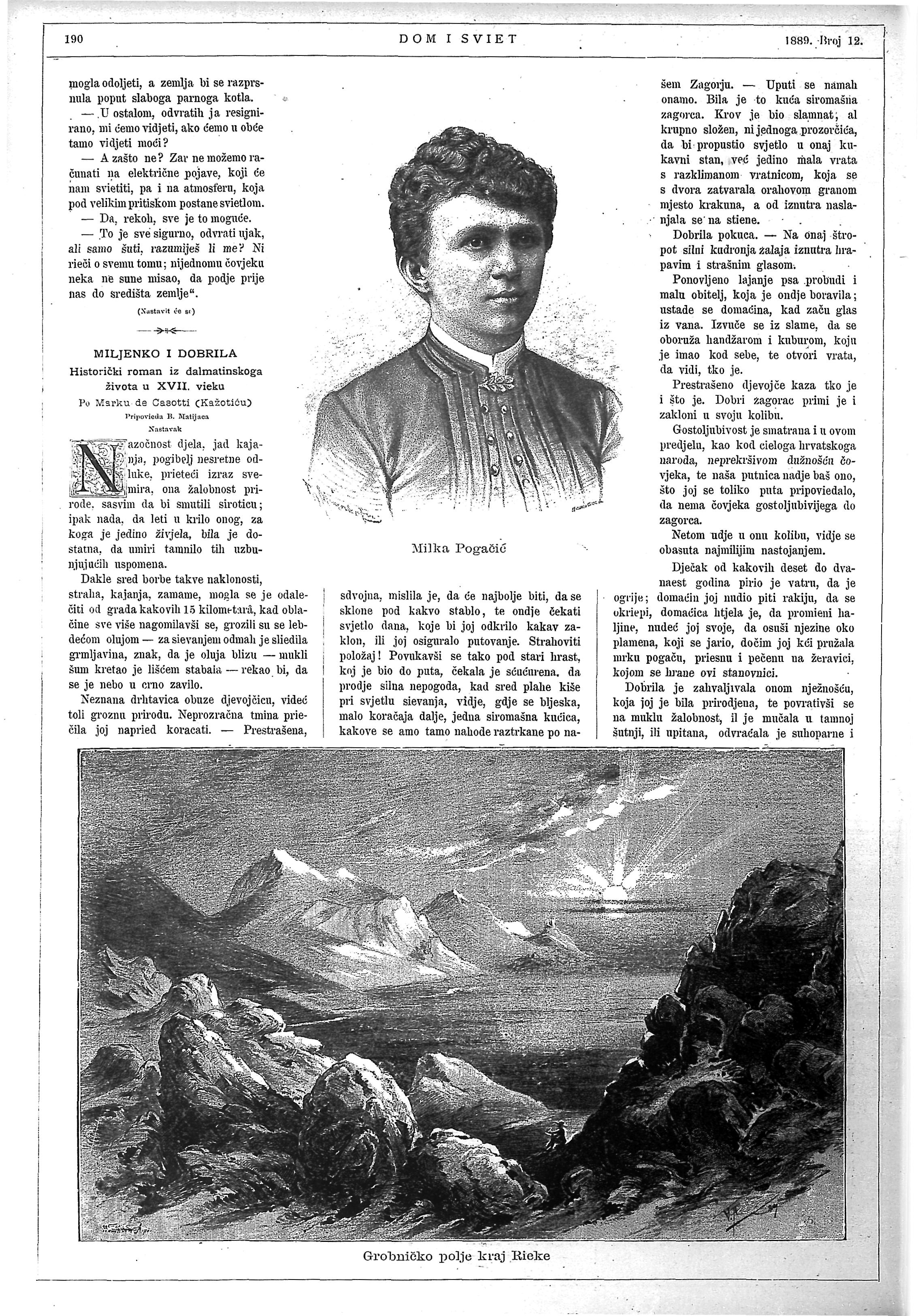 Milka Pogacic ist Lehrerin und übernimmt 1902 die Redaktion der Zeitschrift „Domaće ognjište“ (Heimischer Herd) von Marija Jambrisak. Sie leitet diese bis 1908. Die Mehrheit der Leserinnen und Mitarbeiterinnen der Zeitschrift sind Lehrerinnen, zahlreiche Beiträge beschäftigten sich daher auch mit der Situation von Lehrerinnen.